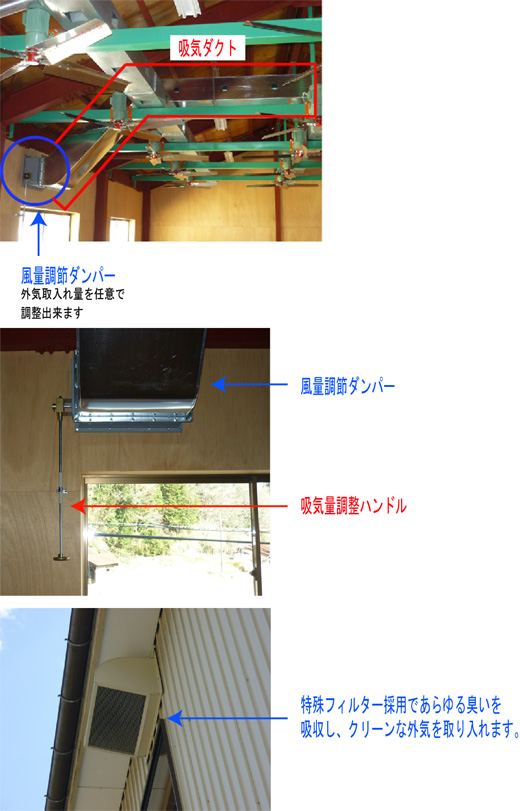 「フクシマ」ではこの関係を考慮して経験的に空気取入れ量を考慮した経験則を持っておりますが、乾燥室の新築、大改造の際には適用し易いのですが、予算、工期等の関係で簡易な方法で安価な施工が出来る、当「フクシマ式外気吸入ダンパー」を開発致しました。