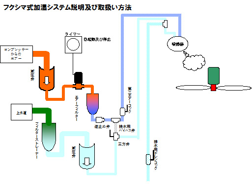 加湿器本体となります。この粒子は3m離れた地点で気化し、湿気になります。従来の加湿器では噴霧速度が遅いため、水滴に変化する場合がありましたが、この機種では改善されています。また噴霧量も11ノズルあたり2.4リットル/hと大量型となっております(最大4ノズルまで可能)。又フロート式の液供給停止装置を内臓しており使用しないときは自動停止します。